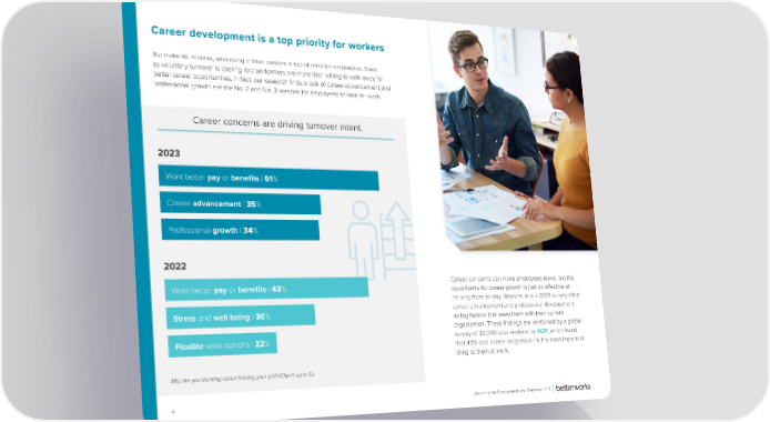 Career development is a top priority for workers But make no mistake, advancing in their careers is top of mind for employees. Even as voluntary turnover is cooling, top performers are more than willing to walk away for better career opportunities. In fact, our research 昀椀nds a lack of career advancement and professional growth are the No. 2 and No. 3 reasons for employees to look for work. Career concerns are driving turnover intent. 2023 Want better pay or bene昀椀ts | 51% Career advancement | 35% Professional growth | 34% 2022 Want better pay or bene昀椀ts | 43% Career concerns can make employees leave, but the opportunity for career growth is just as e昀昀ective at helping them to stay. Workers in our 2023 survey cited Stress and well-being | 30% career advancement and professional development as big factors that keep them with their current organization. These 昀椀ndings are reinforced by a global Flexible work options | 22% survey of 32,000-plus workers by ADP, which found that 40% said career progression is the most important thing to them at work. Why are you thinking about leaving your job? (Check up to 5.) 4 Avoiding the Engagement and Retention Cli昀昀