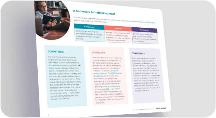 A framework for rethinking trust What are the underlying contributors to workplace trust? One useful model is this framework articulated by Dr. Paul White, a psychologist, speaker, and leadership expert: Competence: Character: Consistency: Believing that the colleague or Believing that the colleague or team Believing that the colleague or team has the capability (knowledge, has integrity, dependability, and team is able to and will follow experience, ability) to complete employees’ interest at heart (versus through in doing the task repeatedly the work. just his or her own interests). and consistently. COMPETENCE CHARACTER CONSISTENCY Doing one’s job well can obviously What does it mean to have a trustworthy Finally, what does it mean for leaders help peers trust one another to pull character at work? Generally speaking, to earn trust through consistency? their weight. But how does leadership it is about upholding ethics, leading Inconsistency is often a story about demonstrate competency and win trust? by example, and treating people fairly. bias and unfairness — two themes that Gallup has found trust is higher when Another piece of this — according to were prevalent in our 2023 research leaders practice three qualities: They scholars — is providing reciprocal report. Bias in the system can a昀昀ect trust lead and support change — setting and respect and trust. The 2022 Edelman in leaders and vice versa. In fact, our communicating goals that then take on Trust Barometer found that when research found that only 1 in 3 employees life throughout the organization. They organizations give people trust, see their performance review system as inspire con昀椀dence in the future, setting employees tend to be more trusting free of bias. This is problematic, as the “the expectation that every manager in return. This can be extended to research showed that more than half discusses with their team how change practicing empathy, transparency, of all employees (55%) see fairness as will impact them.” And 昀椀nally, they and looking to ESG — as the World the single most important factor in their communicate clearly — listening and Economic Forum recently found that employee experience. regularly communicating with team 74% of consumers believe that ethical members via check-ins. practices and values are crucial reasons for choosing a brand, as consumers or employees. 6 Focusing on Fairness to Close the Trust Gap
