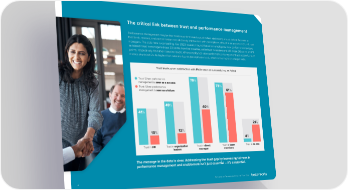 The critical link between trust and performance management Performance management may be the most important lever to push when addressing a trust de昀椀cit. Fairness in feedback, reviews, and compensation are all deeply intertwined with perceptions of trust in an organization, HR, and managers. The data here is compelling. Our 2023 research found that when employees view performance reviews as biased, trust in managers drops 23 points from the baseline, while trust in leaders and HR drops 20 points and 16 points, respectively, from their baseline levels. When employees view performance management as successful, trust metrics skyrocket 2x-4x higher than baseline 昀椀gures (except team trust, which is the highest to begin with). Trust levels when satisfaction with PM is seen as successful vs. as failed Trust: When performance 79% management is seen as a success 73% Trust: When performance 61% management is seen as a failure 49% 40% 41% 21% 10% 12% 4% Trust in HR Trust in organization Trust in direct Trust in team Trust in no one leaders manager members The message in the data is clear. Addressing the trust gap by increasing fairness in performance management and enablement isn’t just essential – it’s existential. 4 Focusing on Fairness to Close the Trust Gap