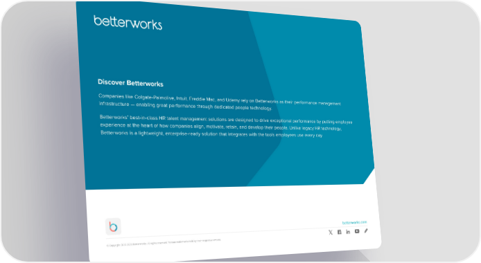 Discover Betterworks Companies like Colgate-Palmolive, Intuit, Freddie Mac, and Udemy rely on Betterworks as their performance management infrastructure — enabling great performance through dedicated people technology. Betterworks’ best-in-class HR talent management solutions are designed to drive exceptional performance by putting employee experience at the heart of how companies align, motivate, retain, and develop their people. Unlike legacy HR technology, Betterworks is a lightweight, enterprise-ready solution that integrates with the tools employees use every day. betterworks.com © Copyright 2013-2023 Betterworks. All rights reserved. Various trademarks held by their respective owners.