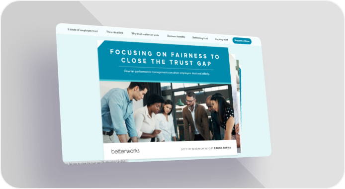 Fewer than 1 in 3 employees see performance reviews as very fair and equitable 25% 37% 8% Inspiring trust in the modern workplace 30% By making real e昀昀orts to back employees and managers, organizations have the potential to elevate trust. A signi昀椀cant opportunity exists in crafting a more fair and balanced performance management system — as part of a better EVP. Alarmingly, our 2023 report revealed that under 1 in 3 employees view their performance evaluations as truly fair — a factor directly in昀氀uencing trust. They are somewhat fair and equitable To turn this around, organizations can focus on robust coaching and more transparent communication They are very fair and equitable among leaders, managers, and employees regarding performance, aspirations, and objectives. This is They are biased also where modern calibration, with its transparency and equity, comes into play. Don’t know Take the next step: Delve into how to establish a performance management process that boosts trust. Download our checklist, 7 Ways to Build More Trustworthy Performance Management. Looking to build a performance management strategy rich in competence, character, and consistency that can amplify trust and foster a culture of inclusion? Betterworks’ platform is designed to align goals, promote fairness, and strengthen manager-employee rapport, laying the groundwork for stronger trust. Together, we can help your workplace bridge the trust gap. Contact us today for a tour of the Betterworks platform. 7 Focusing on Fairness to Close the Trust Gap