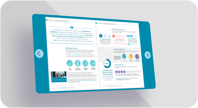 GOOD CONVERSATIONS MATTER A foundational value of regular conversations is meant to build trust and relationship. If employees don’t trust their manager or don’t feel the relationship is sincere, every interaction and conversation remains surface-level. Conversations need to be earnest, open, and honest to be meaningful. Managers are the linchpin in every organization for how employees feel at work. — Caitlin Collins | Organizational Psychologist & Program Strategy Director, Betterworks What employees want Time and again, surveys have shown that employees crave more frequent and substantive guidance, support, and encouragement from managers — and the old annual evaluation just isn’t cutting it for 92% of them. Consider this recent report from McKinsey about what frontline employees are seeking in 2022. Among their top four concerns — along with pay — are: Job Learning Alignment Supportive growth opportunities of skills manager It’s no surprise that all four of these needs are explicitly linked to conversations with managers around performance, goals, and career growth. Yet, despite this appetite for guidance, Betterworks research shows that only 39% of employees say current check-ins are working well for them. So where is the disconnect? What are employees looking for, and how can you provide it? The Betterworks 2022 State of Performance Enablement Report provides some insights. THE MANAGER’S ULTIMATE GUIDE TO GREAT CONVERSATIONS 4