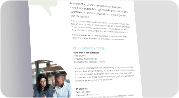 TYPES OF CONVERSATIONS TO CONSIDER A healthy 昀氀ow of communication from managers should incorporate both scheduled conversations and spontaneous, anytime observations, encouragement, and recognition. Here are some of the kinds of conversations you can have, along with their typical frequency. Many of these interactions can be facilitated by templates in your performance management platform — making it easier to create more e昀昀ective moments, whether they are previously scheduled or not. If these templates are not currently available to you, check with HR to determine whether a standard set of questions can be developed. CONVERSATION TYPES Open lines of communication Type: anytime Frequency: 1x per week min Channels: email, video, call, in person An open line of communication is a series of regular, informal touch points with your team and direct reports. This establishes trust, builds relationships, and helps employees feel they can come to you at any time, even when it’s not about work. Check-ins are about connecting with others and feeling connected to managers and the organization. 1:1 Check-ins Type: scheduled Frequency: 2-4x a month Channel: in person, call, video, plus performance management platform with follow-up meeting Use a scheduled template in your performance management solution, if you have one, to focus regularly on an employee’s work and progress on THE MANAGER’S ULTIMATE GUIDE TO GREAT CONVERSATIONS 13