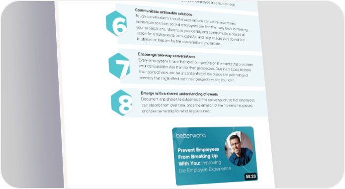 HAVING DIFFICULT CONVERSATIONS Connect as a human, 昀椀rst Use the technology platform to handle the heavy lift of documenting and laying out the problem clearly, so that in the moment, you can focus on empathy, listening, and relating to your employee on a human level. Communicate actionable solutions Tough conversations should always include corrective actions and achievable solutions so that employees can 昀椀nd their way back to meeting your expectations. Make sure you identify and communicate a course of action for employees to be successful, and help ensure they do not feel frustrated or trapped by the conversations you initiate. Encourage two-way conversations Every employee will have their own perspective on the events that precipitate your conversation. Ask them for their perspective. Give them space to share their point of view, and be understanding of the biases and psychology of memory that might a昀昀ect both their perspectives and your own. Emerge with a shared understanding of events Document and share the outcomes of the conversation, so that employees can absorb them over time, once the emotion of the moment has passed, and take ownership for what happens next. THE MANAGER’S ULTIMATE GUIDE TO GREAT CONVERSATIONS 23
