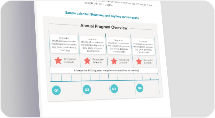 TYPES OF CONVERSATIONS TO CONSIDER The bottom line answer is really: check in with employees when you are inspired and have something to share, and be available to them at their request. The following sample calendar shows what structured and anytime check- ins might look like in practice. Sample calendar: Structured and anytime conversations Annual Program Overview 1x/quarter 1x/quarter 1x/quarter 1x/quarter Structured conversation Structured conversation Structured conversation Structured conversation with templated questions with templated questions with templated questions with templated questions (e.g. goals, performance, (e.g. goals, progress, (e.g. goals, progress, (e.g. goals, progress, coaching) development) development) development) Recognition Recognition Recognition Recognition 2x/month 2x/month 2x/month 2x/month 1:1 check-ins 6-12x/quarter + anytime conversations (as needed) Q1 Q2 Q3 Q4 THE MANAGER’S ULTIMATE GUIDE TO GREAT CONVERSATIONS 16
