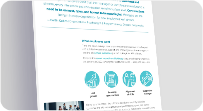 GOOD CONVERSATIONS MATTER A foundational value of regular conversations is meant to build trust and relationship. If employees don’t trust their manager or don’t feel the relationship is sincere, every interaction and conversation remains surface-level. Conversations need to be earnest, open, and honest to be meaningful. Managers are the linchpin in every organization for how employees feel at work. — Caitlin Collins | Organizational Psychologist & Program Strategy Director, Betterworks What employees want Time and again, surveys have shown that employees crave more frequent and substantive guidance, support, and encouragement from managers — and the old annual evaluation just isn’t cutting it for 92% of them. Consider this recent report from McKinsey about what frontline employees are seeking in 2022. Among their top four concerns — along with pay — are: Job Learning Alignment Supportive growth opportunities of skills manager It’s no surprise that all four of these needs are explicitly linked to conversations with managers around performance, goals, and career growth. Yet, despite this appetite for guidance, Betterworks research shows that only 39% of employees say current check-ins are working well for them. So where is the disconnect? What are employees looking for, and how can you provide it? The Betterworks 2022 State of Performance Enablement Report provides some insights. THE MANAGER’S ULTIMATE GUIDE TO GREAT CONVERSATIONS 4