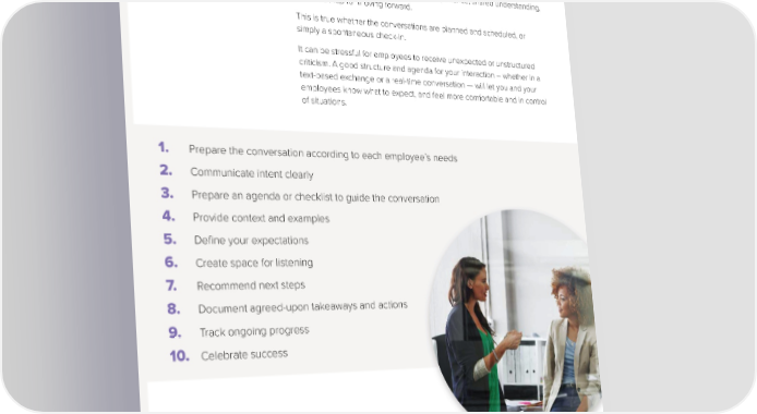 WHAT TO SAY AND HOW TO SAY IT ANATOMY OF A GOOD CONVERSATION Going into an employee conversation with a clear structure and purpose is instrumental to emerging with a positive experience, shared understanding, and road map for moving forward. This is true whether the conversations are planned and scheduled, or simply a spontaneous check-in. It can be stressful for employees to receive unexpected or unstructured criticism. A good structure and agenda for your interaction – whether in a text-based exchange or a real-time conversation — will let you and your employees know what to expect, and feel more comfortable and in control of situations. 1. Prepare the conversation according to each employee’s needs 2. Communicate intent clearly 3. Prepare an agenda or checklist to guide the conversation 4. Provide context and examples 5. De昀椀ne your expectations 6. Create space for listening 7. Recommend next steps 8. Document agreed-upon takeaways and actions 9. Track ongoing progress 10. Celebrate success THE MANAGER’S ULTIMATE GUIDE TO GREAT CONVERSATIONS 20