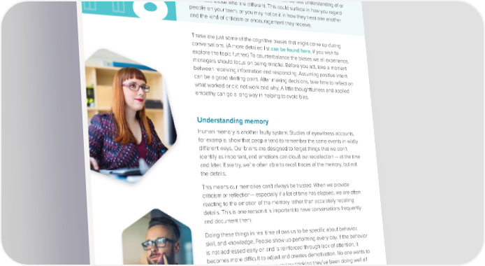 WHAT TO SAY AND HOW TO SAY IT A昀漀nity bias – The a昀漀nity bias causes people to gravitate toward others who appear to be like them. This means we have a preference for those we are most like or who are most like us, and can be less understanding of or fair toward those who are di昀昀erent. This could surface in how you regard people on your team, or you may notice it in how they treat one another 8 and the kind of criticism or encouragement they receive. These are just some of the cognitive biases that might come up during conversations. (A more detailed list can be found here, if you wish to explore the topic further.) To counterbalance the biases we all experience, managers should focus on being mindful. Before you act, take a moment between receiving information and responding. Assuming positive intent can be a good starting point. After making decisions, take time to re昀氀ect on what worked or did not work and why. A little thoughtfulness and applied empathy can go a long way in helping to avoid bias. Understanding memory Human memory is another faulty system. Studies of eyewitness accounts, for example, show that people tend to remember the same events in wildly di昀昀erent ways. Our brains are designed to forget things that we don’t identify as important, and emotions can cloud our recollection — at the time and later. If we try, we’re often able to recall traces of the memory, but not the details. This means our memories can’t always be trusted. When we provide criticism or re昀氀ection— especially if a lot of time has elapsed, we are often reacting to the emotion of the memory rather than accurately recalling details. This is one reason it is important to have conversations frequently and document them. Doing these things in real time allows us to be speci昀椀c about behavior, skill, and knowledge. People show up performing every day. If the behavior is not addressed early on and is reinforced through lack of attention, it becomes more di昀漀cult to adjust and creates demotivation. No one wants to go into an annual performance review thinking they’ve been doing well all year, only to 昀椀nd out they have not. When evaluating, coaching, providing feedback, or recognizing your employees, frequency matters. Real-time conversations matter. THE MANAGER’S ULTIMATE GUIDE TO GREAT CONVERSATIONS 19
