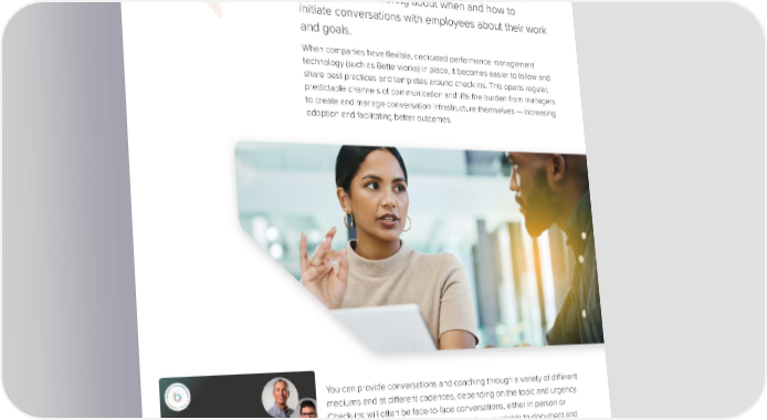 PLANNING YOUR CONVERSATIONS You may be wondering about when and how to initiate conversations with employees about their work and goals. When companies have 昀氀exible, dedicated performance management technology (such as Betterworks) in place, it becomes easier to follow and share best practices and templates around check-ins. This opens regular, predictable channels of communication and lifts the burden from managers to create and manage conversation infrastructure themselves — increasing adoption and facilitating better outcomes. You can provide conversations and coaching through a variety of di昀昀erent mediums and at di昀昀erent cadences, depending on the topic and urgency. Check-ins will often be face-to-face conversations, either in person or virtually, but it is important to have technology available to document and create more accessibility and transparency in the process. THE MANAGER’S ULTIMATE GUIDE TO GREAT CONVERSATIONS 9
