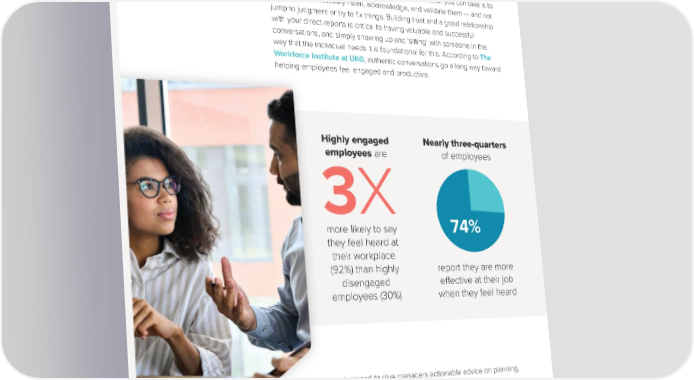 GOOD CONVERSATIONS MATTER To be heard Helping employees feel heard means providing space for them to express their thoughts and feelings. As a manger, the best action you can take is to actively and re昀氀ectively listen, acknowledge, and validate them — and not jump to judgment or try to 昀椀x things. Building trust and a good relationship with your direct reports is critical to having valuable and successful conversations, and simply showing up and ‘sitting’ with someone in the way that the individual needs it is foundational for this. According to The Workforce Institute at UKG, authentic conversations go a long way toward helping employees feel engaged and productive. Highly engaged Nearly three-quarters employees are of employees 3X more likely to say 74% they feel heard at their workplace (92%) than highly report they are more disengaged e昀昀ective at their job employees (30%) when they feel heard This guide is designed to give managers actionable advice on planning, structuring, and having more e昀昀ective conversations with employees. THE MANAGER’S ULTIMATE GUIDE TO GREAT CONVERSATIONS 6