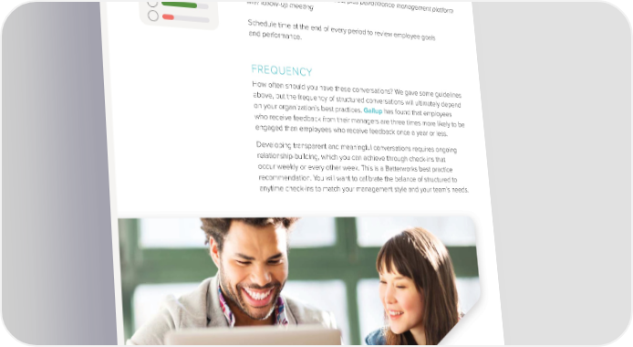 TYPES OF CONVERSATIONS TO CONSIDER End-of-quarter goals and performance review Type: scheduled Frequency: 1x a quarter Channels: in person, call, or video, plus performance management platform with follow-up meeting Schedule time at the end of every period to review employee goals and performance. FREQUENCY How often should you have these conversations? We gave some guidelines above, but the frequency of structured conversations will ultimately depend on your organization’s best practices. Gallup has found that employees who receive feedback from their managers are three times more likely to be engaged than employees who receive feedback once a year or less. Developing transparent and meaningful conversations requires ongoing relationship-building, which you can achieve through check-ins that occur weekly or every other week. This is a Betterworks best practice recommendation. You will want to calibrate the balance of structured to anytime check-ins to match your management style and your team’s needs. THE MANAGER’S ULTIMATE GUIDE TO GREAT CONVERSATIONS 15
