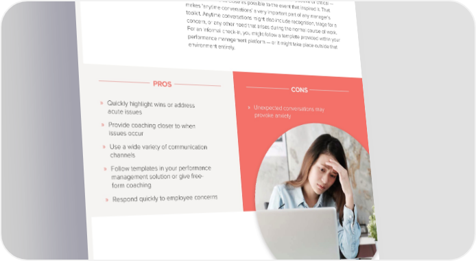 PLANNING YOUR CONVERSATIONS 2. Anytime conversations Spontaneous feedback is a good way to respond to urgent needs. Studies show that coaching on behavior — whether positive or critical — is best provided as close as possible to the event that inspired it. That makes ‘anytime conversations’ a very important part of any manager’s toolkit. Anytime conversations might also include recognition, triage for a concern, or any other need that arises during the normal course of work. For an informal check-in, you might follow a template provided within your performance management platform — or it might take place outside that environment entirely. PROS CONS » Quickly highlight wins or address » Unexpected conversations may acute issues provoke anxiety » Provide coaching closer to when issues occur » Use a wide variety of communication channels » Follow templates in your performance management solution or give free- form coaching » Respond quickly to employee concerns THE MANAGER’S ULTIMATE GUIDE TO GREAT CONVERSATIONS 11