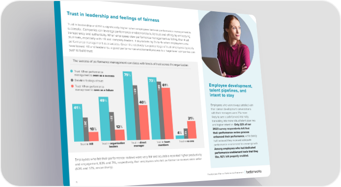 Trust in leadership and feelings of fairness Trust in leadership and HR is signi昀椀cantly higher when employees believe performance management is successful. Companies can leverage performance enablement to build trust and a昀케nity by embodying transparency and authenticity. When employees view performance management as failing, their trust plummets, especially with HR and company leaders. It skyrockets by 2x to 4x when employees view performance management as a success. Given the relatively low percentage of trust employees typically have toward HR and leadership, a good performance enablement process is a huge lever companies can push to build trust. The success of performance management correlates with levels of trust across the organization Trust: When performance 79% management is seen as a success 73% Baseline feelings of trust 68 61% Employee development, Trust: When performance 63 % talent pipelines, and management is seen as a failure % intent to stay 49% 40% 41% Employees who were always satis昀椀ed with their career development conversations with their managers were 7.5x more 32 likely to see a path forward internally, 26 % 21% translating into more robust talent pipelines % 10% 12% and higher retention. Only 32% of our 4% 12 2023 survey respondents felt that % their performance review process enhanced their performance, while barely Trust in HR Trust in organization Trust in direct Trust in team Trust in no one half believed they received adequate leaders manager members performance enablement for career growth. Among employees who had dedicated Employees who felt their performance reviews were very fair and equitable reported higher productivity performance enablement tools that they and engagement, 83% and 71%, respectively, than employees who felt performance reviews were unfair like, 92% felt properly enabled. (60% and 57%, respectively). 5 The Multiplier E昀昀ect of Performance Enablement