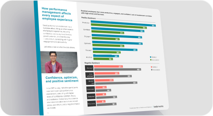 How performance Enabled employees feel more productive, engaged, and confident. Lack of enablement correlates management affects with high stress and burnout. every aspect of Positive Sentiment employee experience Productive 65% 55% Good performance enablement has a 52% multiplier e昀昀ect, lifting up other aspects Con昀椀dent 31% of employee experience, including con昀椀dence, belonging, trust, fairness, Engaged 49% growth potential, and intent to stay 26% — and, in turn, correlating with higher 49% engagement and productivity. Optimistic 30% Let’s take a look at what the data shows. 43% Focused 26% Resilient 24% Enabled 18% Not enabled Negative Sentiment Stressed 27% Enabled 45% Not enabled Over- 23% Confidence, optimism, whelmed 35% and positive sentiment Burned 17% out 40% In our SPE survey, half of the participants 10% reported meaningful performance Distracted 14% enablement, coinciding with higher levels of con昀椀dence, optimism, focus, Detached 9% and resilience. Conversely, the absence 19% of enablement often leads to increased 8% stress, overwhelm, and a negative impact Pessimistic 18% on morale. 3 The Multiplier E昀昀ect of Performance Enablement