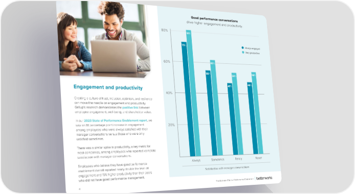 Good performance conversations drive higher engagement and productivity. 80% 81% 73% Always engaged Very productive 60% 62% 55% 54% 55% 47% 48% Engagement and productivity 40% Creating a culture of trust, inclusion, optimism, and resilience can move the needle on engagement and productivity. Gallup’s research demonstrates the positive link between employee engagement, well-being, and shareholder value. In our 2023 State of Performance Enablement report, we saw an 18 percentage point increase in engagement 20% among employees who were always satis昀椀ed with their manager conversations versus those who were only satis昀椀ed sometimes. There was a similar spike in productivity, a key metric for most companies, among employees who reported complete satisfaction with manager conversations. Employees who believe they have good performance Always Sometimes Rarely Never enablement overall reported nearly double the level of engagement and 16% higher productivity than their peers Satisfaction with manager conversations who did not have good performance management. 6 The Multiplier E昀昀ect of Performance Enablement