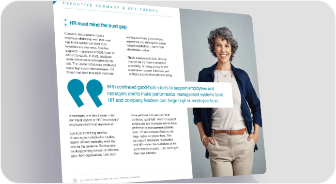 E X E C U T I V E S U M M A R Y & KEY THEMES HRmustmindthetrustgap Concerns about fairness have a working toelevate theemployee reciprocal relationship with trust —as experience andshiftingtheir values bias in the system can afect trust towardstakeholder —ratherthan in leaders and vice versa. Trust has shareholder—value. stagnated —andonceeroded, itcanbe difcult to rebuild. In 2023, employee Thisis asnapshotintime.Distrust levels of trust are at a dangerously low maystill be high due to economic ebb. Theupsideisthatmanyemployees uncertainty, or it may simplybe that report high trust in their managers. Still, stakeholder-focused initiatives, such three in ten don’t trust team members as those around employee well-being, Withcontinuedgood-faithefortstosupportemployees and managersandtomakeperformance management systemsfairer, HRandcompany leaderscan forge higher employee trust. or managers, andabout seven inten have yet to be fully realized. With don’t trust leaders or HR. Tenpercent of continued good-faith eforts to support employeesdon’t trust anyone at all. employees andmanagersandtomake performance managementsystems Lowtrust isnot abigsurprise. fairer, HR and company leaders can Accordingtomultipleother studies, forge higher employee trust.This trust in HR and leadership were low canassureemployees thatleaders prior to the pandemic. But they may and HR —often the custodiansof the bedisappointingtoread, nonetheless, performance process —are working in given how organizations have been their best interests. 2023 Global HR Research Report: The State of Performance Enablement 11