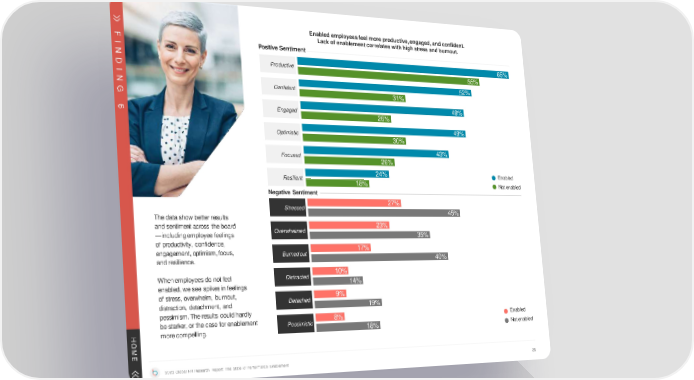 Enabledemployeesfeel moreproductive,engaged, andconfident. Lack of enablementcorrelates withhighstress andburnout. F Positive Sentiment I N Productive 65% D 55% I 52% N Confident G 31% 49% 6 Engaged 26% Optimistic 49% 30% Focused 43% 26% Resilient 24% Enabled 18% Notenabled Negative Sentiment Stressed 27% Thedatashowbetterresults 45% andsentiment across theboard Overwhelmed 23% —includingemployeefeelings 35% of productivity, confidence, 17% engagement,optimism,focus, Burnedout 40% andresilience. Whenemployeesdonotfeel Distracted 10% enabled, wesee spikesinfeelings 14% of stress, overwhelm, burnout, Detached 9% distraction, detachment, and 19% pessimism.Theresults could hardly 8% Enabled bestarker, or the case for enablement Pessimistic H morecompelling. 18% Notenabled O M E 2023 Global HR Research Report: The State of Performance Enablement 38