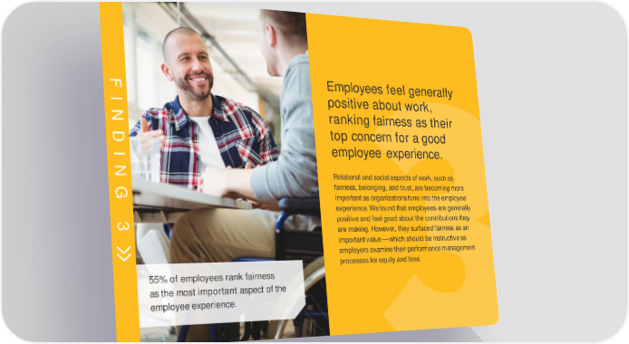 F Employees feel generally IN positive about work, ranking fairness as their D top concern for a good IN employee experience. Relational and socialaspectsof work, such as G fairness, belonging, and trust,are becomingmore importantas organizationstune into the employee experience.Wefoundthatemployeesaregenerally 3 positiveand feel good about the contributions they aremaking. However, theysurfacedfairness as an importantvalue—whichshouldbeinstructiveas employersexaminetheirperformancemanagement processesforequityand bias. 55%ofemployeesrank fairness as the most important aspect of the employeeexperience.