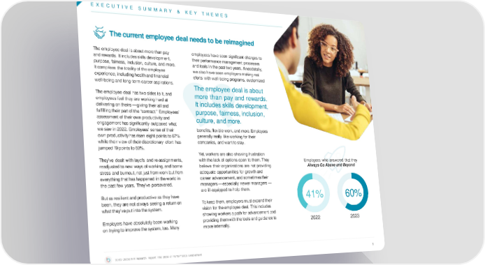 E X E C U T I V E S U M M A R Y & KEY THEMES Thecurrentemployeedealneedstobereimagined Theemployeedeal isabout morethanpay employeeshaveseen significant changes to andrewards. It includesskills development, their performancemanagement processes purpose, fairness, inclusion, culture, and more. andtools inthepast twoyears. Anecdotally, It comprises thetotalityof theemployee wealsohaveseen employersmakingreal experience, includinghealthandfinancial eforts with well-being programs, customized well-beingandlong-termcareer aspirations. Theemployee deal isabout Theemployeedeal hastwosidestoit,and more than pay and rewards. employeesfeel they are workinghardat It includes skills development, delivering on theirs—givingtheir all and fulfillingtheir part of the “contract.” Employees’ purpose, fairness, inclusion, assessment of their own productivityand culture, and more. engagementhassignificantly outpaced what wesawin2022.Employees’ senseof their benefits, flexible work, and more. Employees ownproductivityhasrisen eight pointsto67% generally really like working for their whiletheir view of their discretionary efort has companies, andwanttostay. jumped19pointsto60%. Yet, workers are also showing frustration They’ve dealt with layofs and re-assignments, withthe lack of options open to them.They Employees who answered that they readjustedtonew waysof working,andborne believe their organizations are not providing AlwaysGoAboveandBeyond stress and burnout,not just from work but from adequate opportunities for growth and everythingthathashappened intheworld in career advancement,and sometimestheir thepast few years. They’ve persevered. managers—especially newer managers— are ill-equipped to help them. Butas resilient andproductive as theyhave 41% 60% been, theyare not always seeing areturnon To keep them,employersmustexpand their whatthey’veputintothesystem. vision for theemployee deal. Thisincludes showingworkersapathfor advancement and Employershaveabsolutelybeen working providing themwiththetools andguidanceto 2022 2023 on tryingtoimprovethesystem,too. Many moveinternally. 2023 Global HR Research Report: The State of Performance Enablement 8